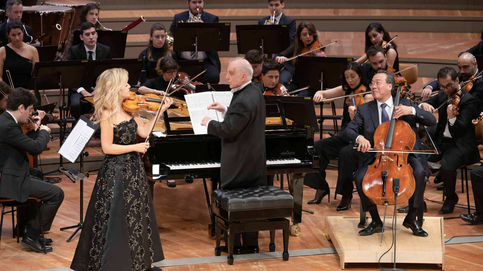 Das von Daniel Barenboim gemeinsam mit dem Literaturwissenschaftler Edward Said aus der Taufe gehobene West-Eastern Divan Orchestra feierte mit dem umjubelten Konzertauftritt sein 20-jähriges Bestehen. Daniel Barenboim dirigierte den Klangkörper mit Musikern aus Israel, Palästina, Syrien, dem Libanon, Ägypten, Jordanien, der Türkei, Algerien und dem Iran vom Klavier aus selbst und trieb ihn zu wahren Höchstleistungen an. Yo-Yo Ma und Anne-Sophie Mutter ließen sich von der euphorischen Stimmung im Saal tragen. Der amerikanische Cellist und die deutsche Geigerin, die seit 40 Jahren erstmalig wieder gemeinsam musizierten, belebten das Concerto mit ihrer virtuosen Klasse.